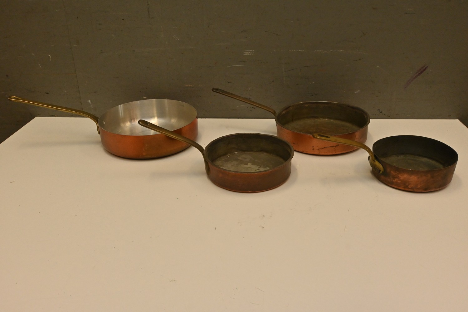 A SET OF FOUR COPPER POTS (24DIAMETER CM) (LEONARD JOEL DELIVERY SIZE: MEDIUM)