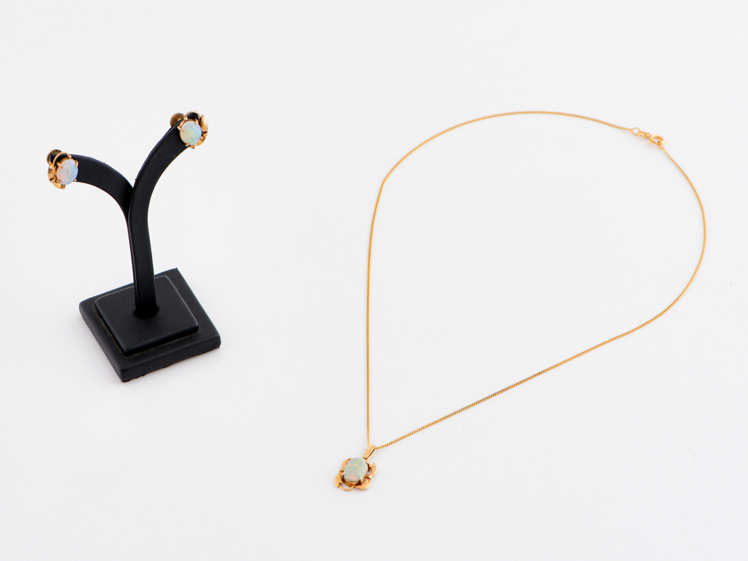 AN OPAL PENDANT IN 18CT GOLD, SIZE 12 X 23MM, WEIGHT 2.6GMS, TO A CHAIN IN 9CT GOLD, LENGTH 480MM, WEIGHT 2.1GMS, TOGETHER WITH A PAIR OF OPAL EARRINGS IN 14CT GOLD, TO SCREW BACK FITTINGS, SIZE12 X 15MM, WEIGHT 3.7GMS.
