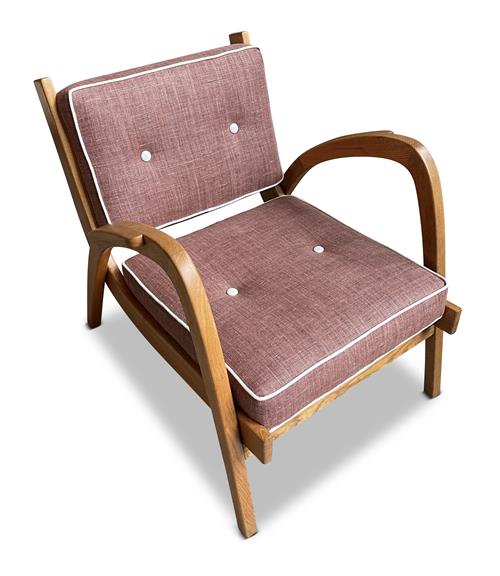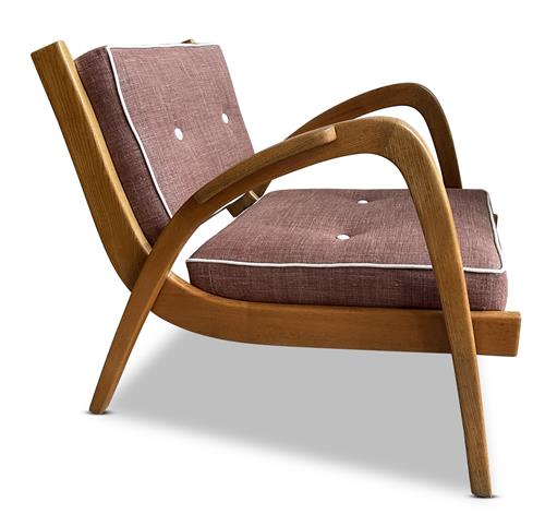 Solid oak frame, brand new cushions upholstered in quality cotton.