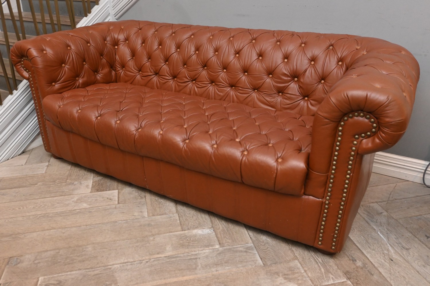A THREE-SEAT CHESTERFIELD SOFA IN TAN LEATHER (80H X 220W X 100D CM) (THIS HEAVY ITEM MUST BE REMOVED BY CLIENTS OR CARRIERS AT THE CUSTOMERS EXPENSE. LEONARD JOEL STAFF CANNOT ASSIST CARRYING THIS ITEM)