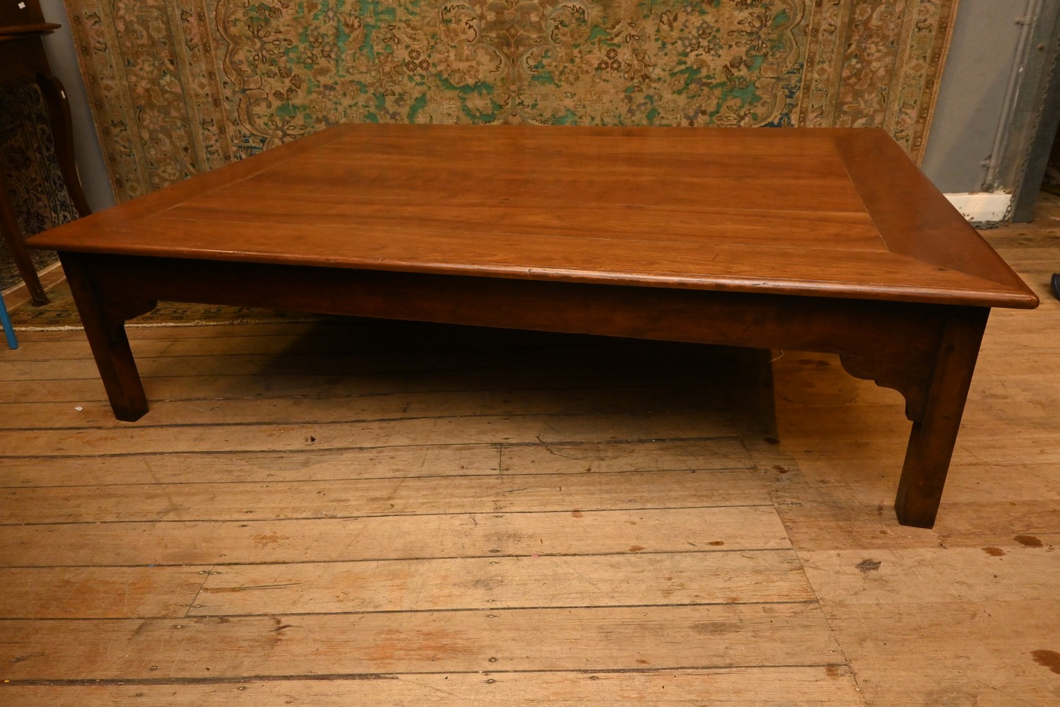 A LARGE CHERRY LOW TABLE IN ANTIQUE FRENCH PROVINCIAL STYLE (42H X 168W X 125D CM) (THIS HEAVY ITEM MUST BE REMOVED BY CLIENTS OR CARRIERS AT THE CUSTOMERS EXPENSE. LEONARD JOEL STAFF CANNOT ASSIST CARRYING THIS ITEM)