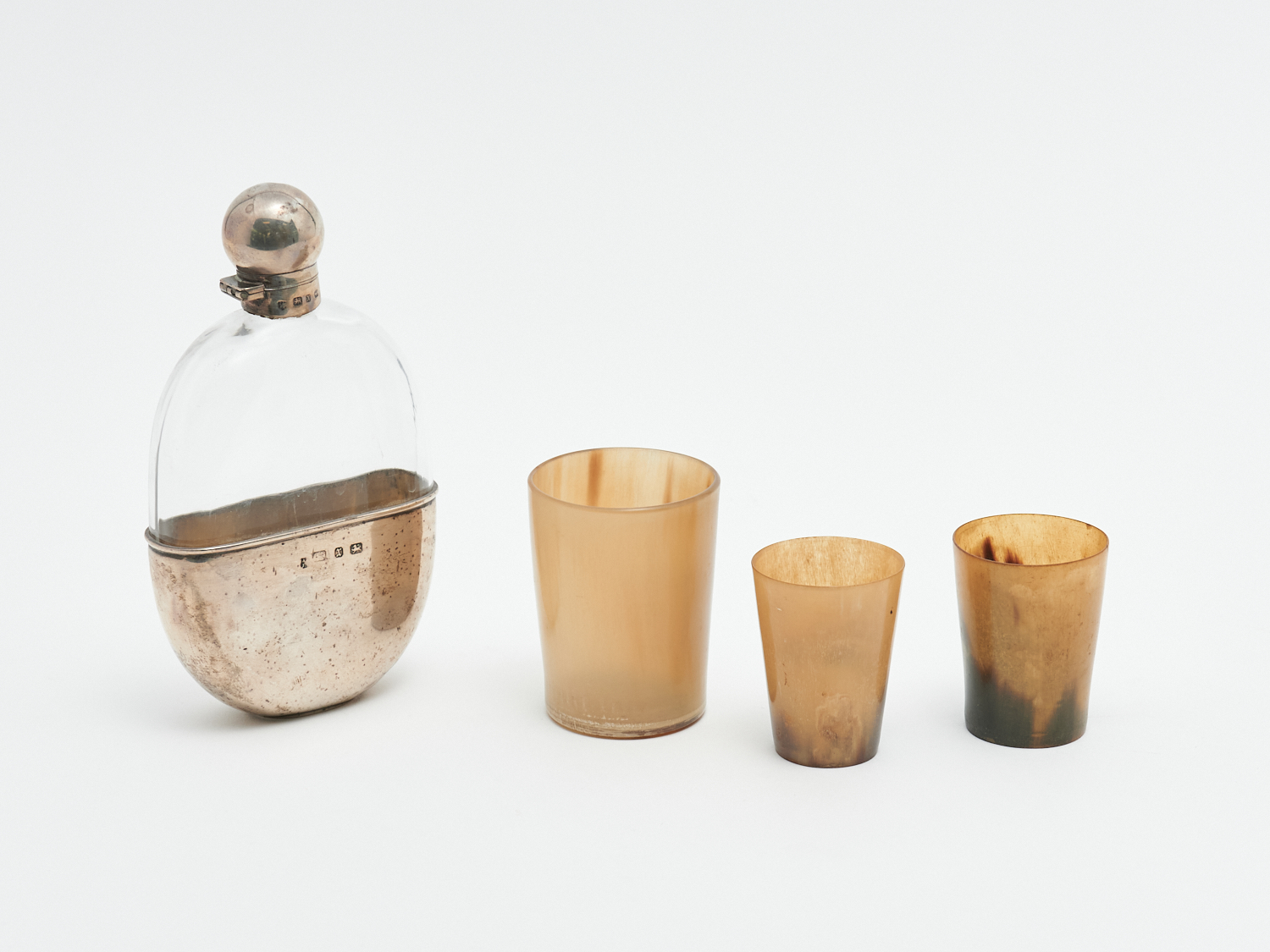 A STERLING SILVER AND GLASS FLASK WITH HORN BEAKERS (A/F), LEONARD JOEL LOCAL DELIVERY: SMALL