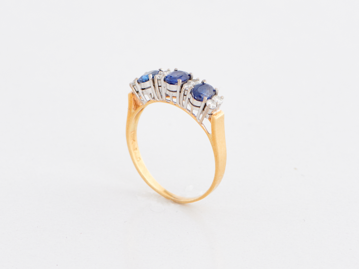 A SAPPHIRE AND DIAMOND RING IN TWO TONE 18CT GOLD, THE SAPPHIRES TOTALLING APPROXIMATELY 0.9CTS, RING SIZE L, WEIGHT 2.9GMS