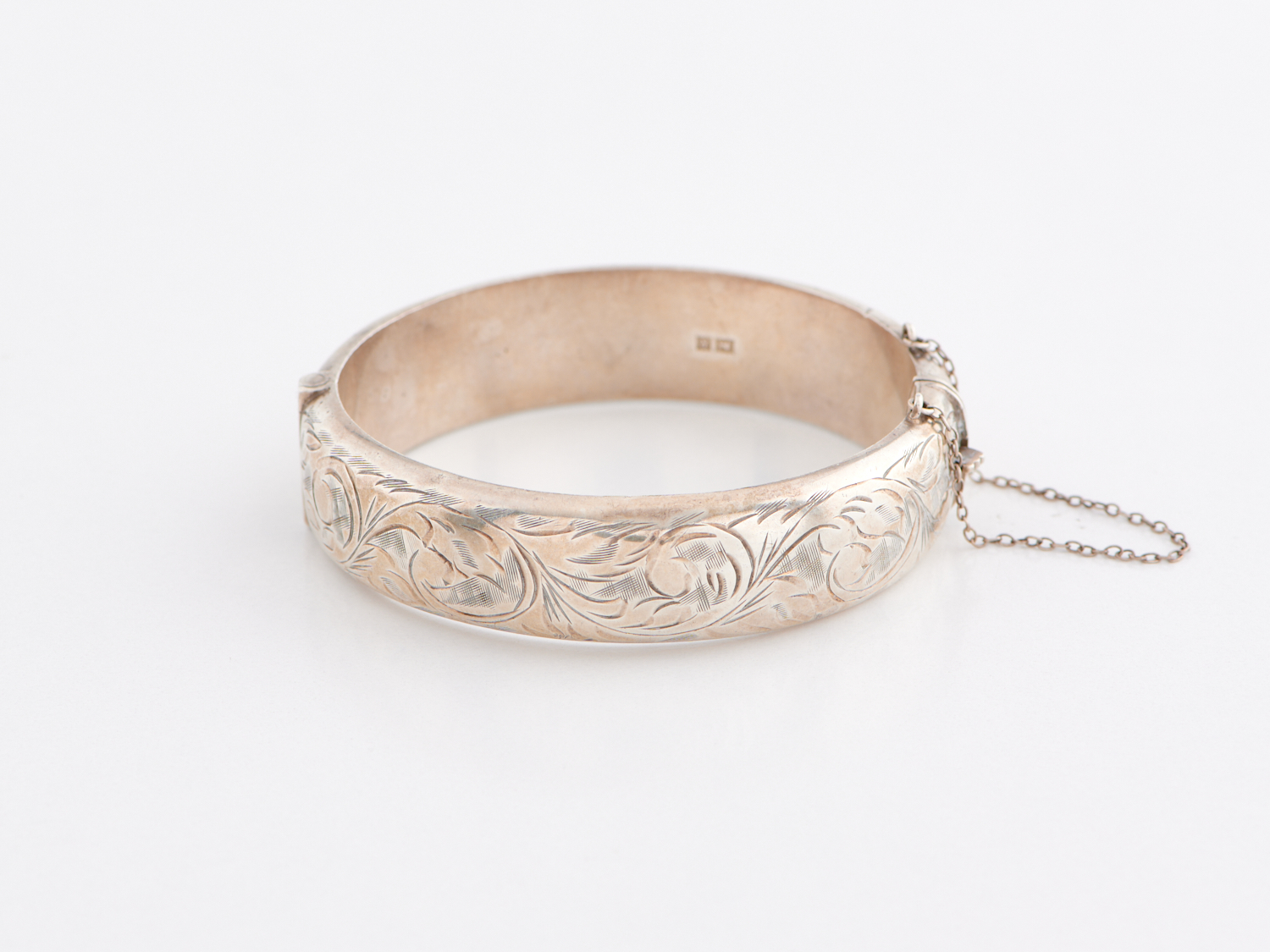 AN ENGRAVED HUNGED CUFF IN STERLING SILVER, BIRMINGHAM HALLAMRKS, DIAMETER 60MM