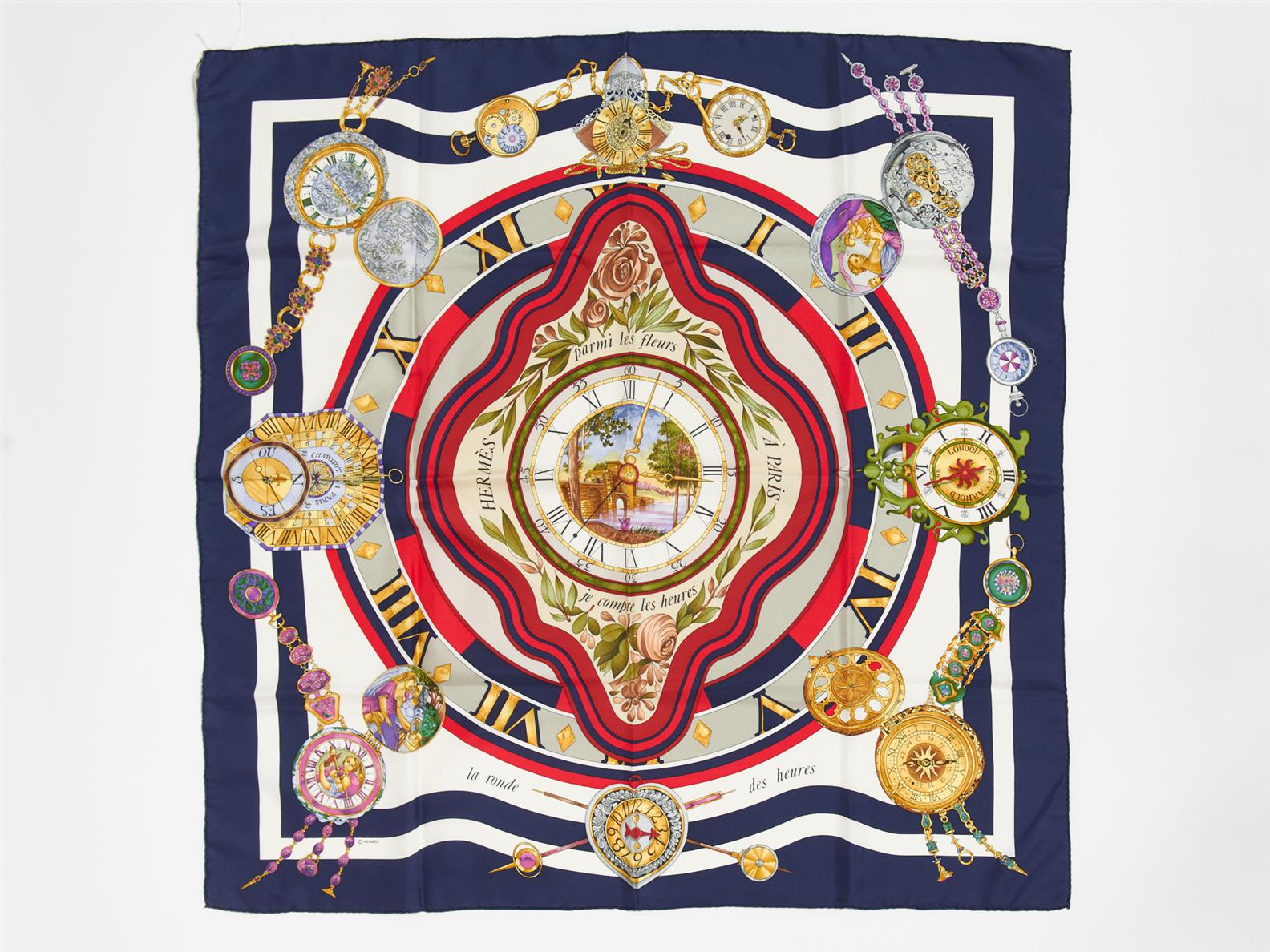 HERMÈS, SILK CARRÉ - La Ronde des Heures by Loïc Dubigeon featuring the dial of a clock within a navy border, 90cm squared.