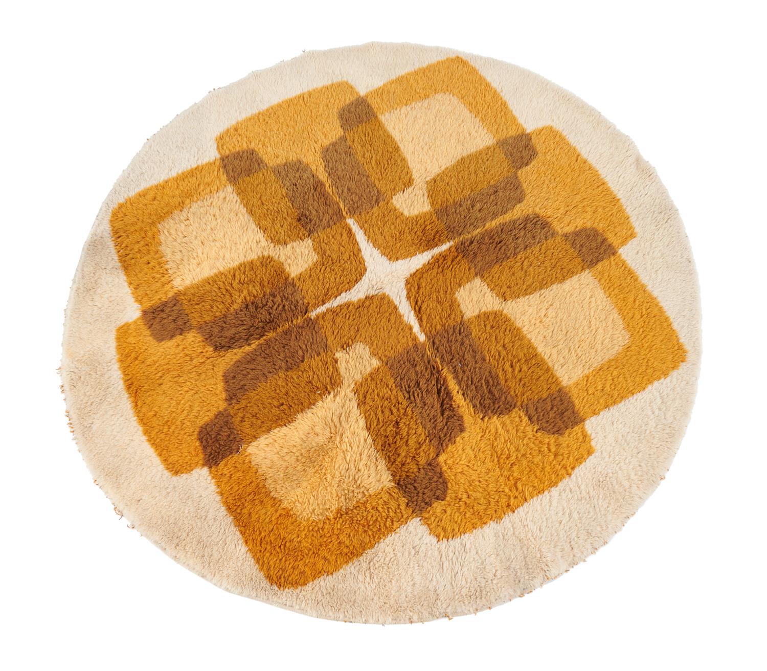 Orange, cream and brown square patterns. Cotton and acrylic.