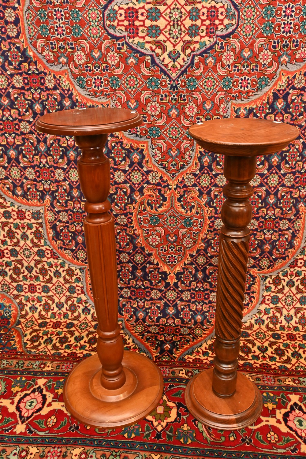 TWO SIMILAR TURNED HARDWOOD PEDESTALS (A/F) ( 102H CM) (LEONARD JOEL DELIVERY SIZE: LARGE)