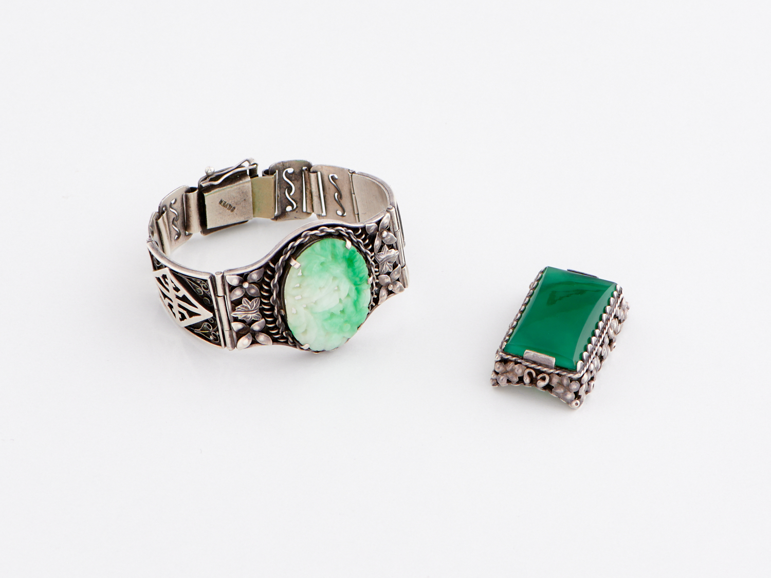 A VINTAGE CARVED JADE BRACELET, TOGETHER WITH A CHRYSOPRASE PENDANT BOTH IN SILVER