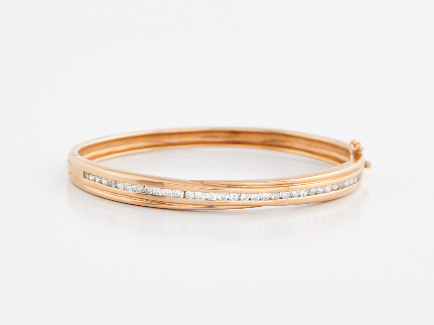 A CUBIC ZIRCONIA SET BANGLE IN 9CT GOLD, DIAMETER 55MM, WEIGHT 17.5GMS