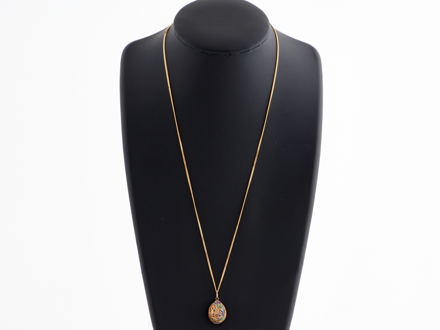 A VINTAGE RUSSIAN ENAMELD EGG PENDANT TO A 9CT GOLD CHAIN NECKLACE, CHAIN LENGTH 600MM, CHAIN WEIGHT 3.2GMS.