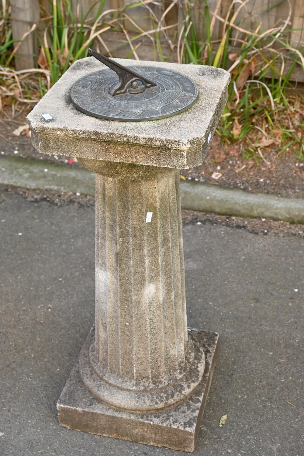 A RECONSTITUTED STONE DORIC COLUMN PEDESTAL MOUNTED WITH A SUNDIAL (A/F) (91H X 31W X 32D CM) (THIS HEAVY ITEM MUST BE REMOVED BY CLIENTS OR CARRIERS AT THE CUSTOMERS EXPENSE. LEONARD JOEL STAFF CANNOT ASSIST CARRYING THIS ITEM)