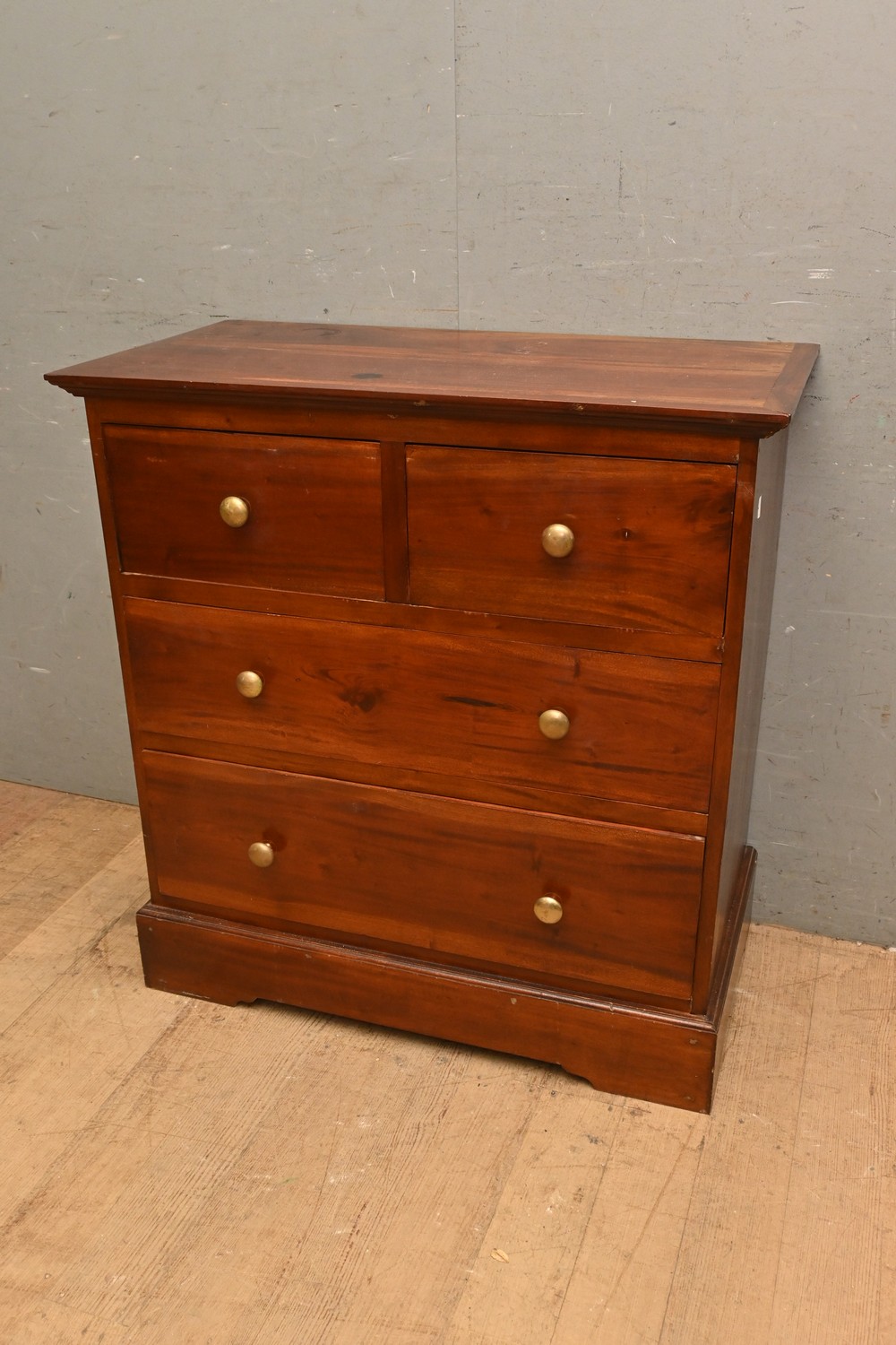 A HARDWOOD CHEST OF DRAWERS WITH BRASS PULLS ( A/F) ( 90H X 86W X 45D CM) (LEONARD JOEL DELIVERY SIZE: X-LARGE)