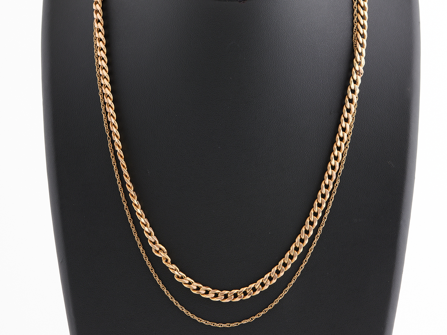 TWO GOLD CHAINS IN 9CT GOLD, LENGTHS APROXIMATELY 550MM AND 520MM, 21.23GMS