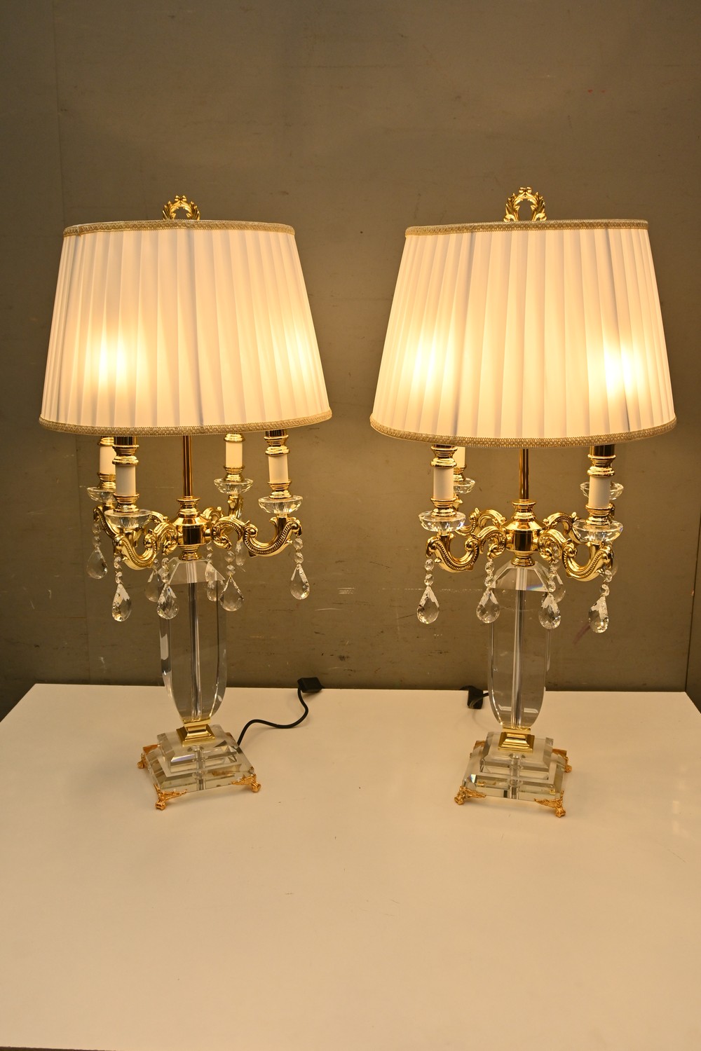 A PAIR OF DECORATIVE FOUR BRANCH PERSPEX AND CRYSTAL TABLE LAMPS WITH SILK SHADES (81H X 38D CM) (LEONARD JOEL DELIVERY SIZE: LARGE)