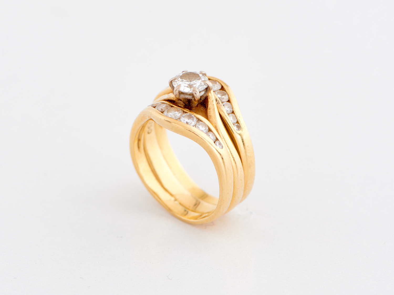 A DIAMOND RING SET IN 18CT GOLD, THE CENTRING DIAMOND WEIGHING APPROXIMATELY 0.6CTS, RING SIZE L-M, WEIGHT 9.3GMS