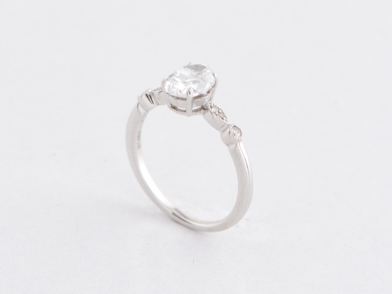 A DIAMOND RING IN 14CT WHITE GOLD, RING SIZE K, THE CENTRAL OVAL CUT DIAMOND TOTALLING 1.01CTS (I-J, P1-P2), ACCOMPANIED BY VALUATION