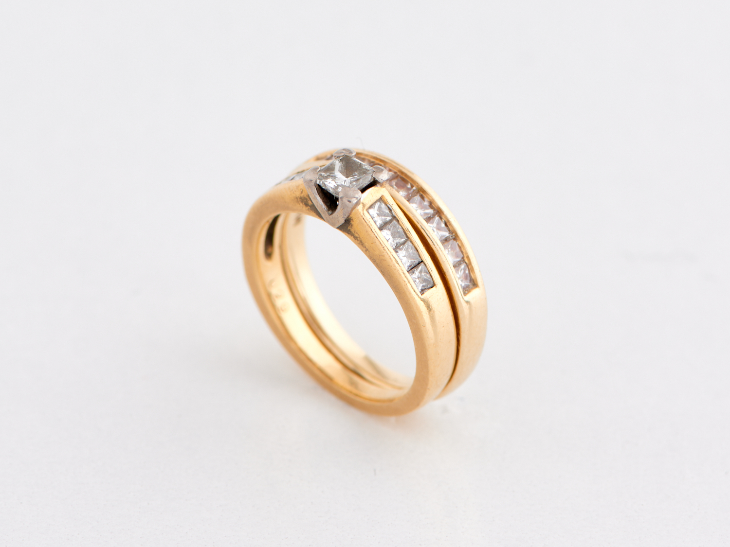A PRINCESS CUT DIAMOND RING IN 18CT GOLD, RING SIZE K, WEIGHT 3.9GMS, TOGETHER WITH A CHANNEL SET DIAMOND WEDDER IN 14CT GOLD, RING SIZE K, WEIGHT 2.9GMS.