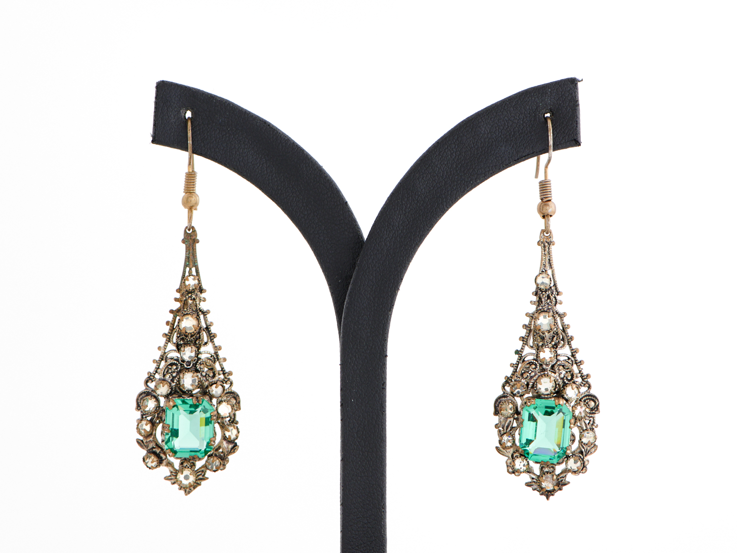 A PAIR OF EARLY VINTAGE FAUX EMERALD EARRINGS IN SILVER TONE METAL, TO SHEPHERD HOOK FITTINGS