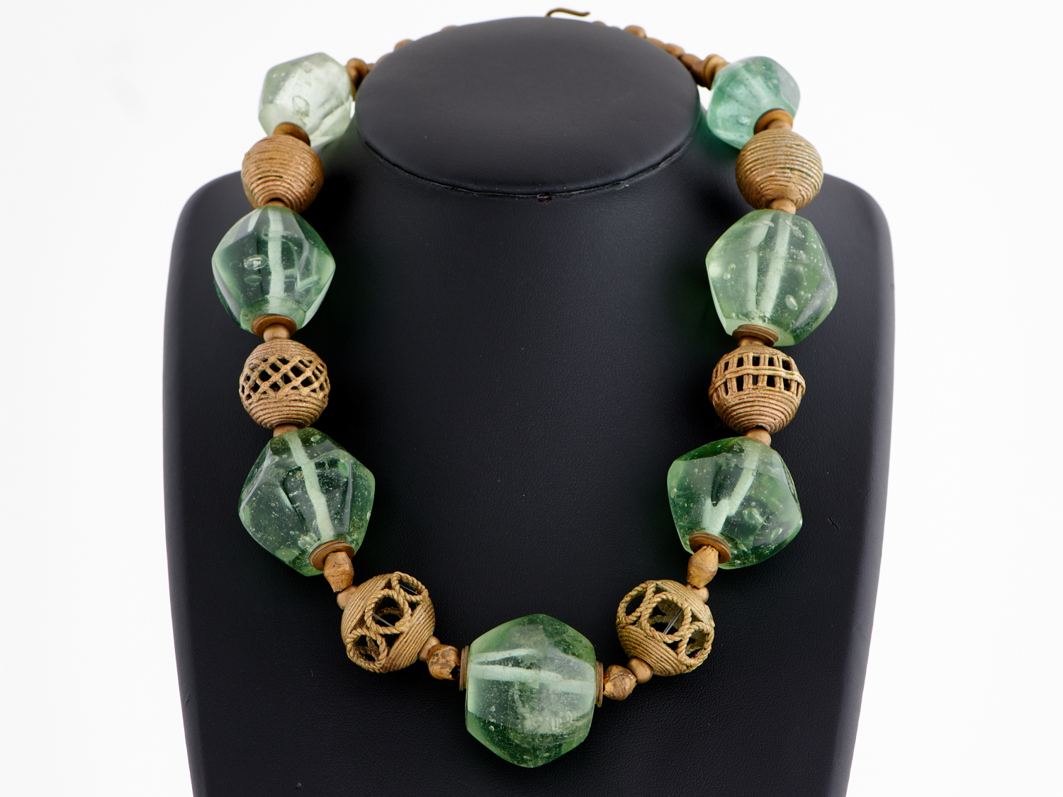 A VINTAGE LARGE GREEN GLASS BEAD NECKLACE WITH BRASS WIRE BEAD SPACERS, LENGTH 500MM.