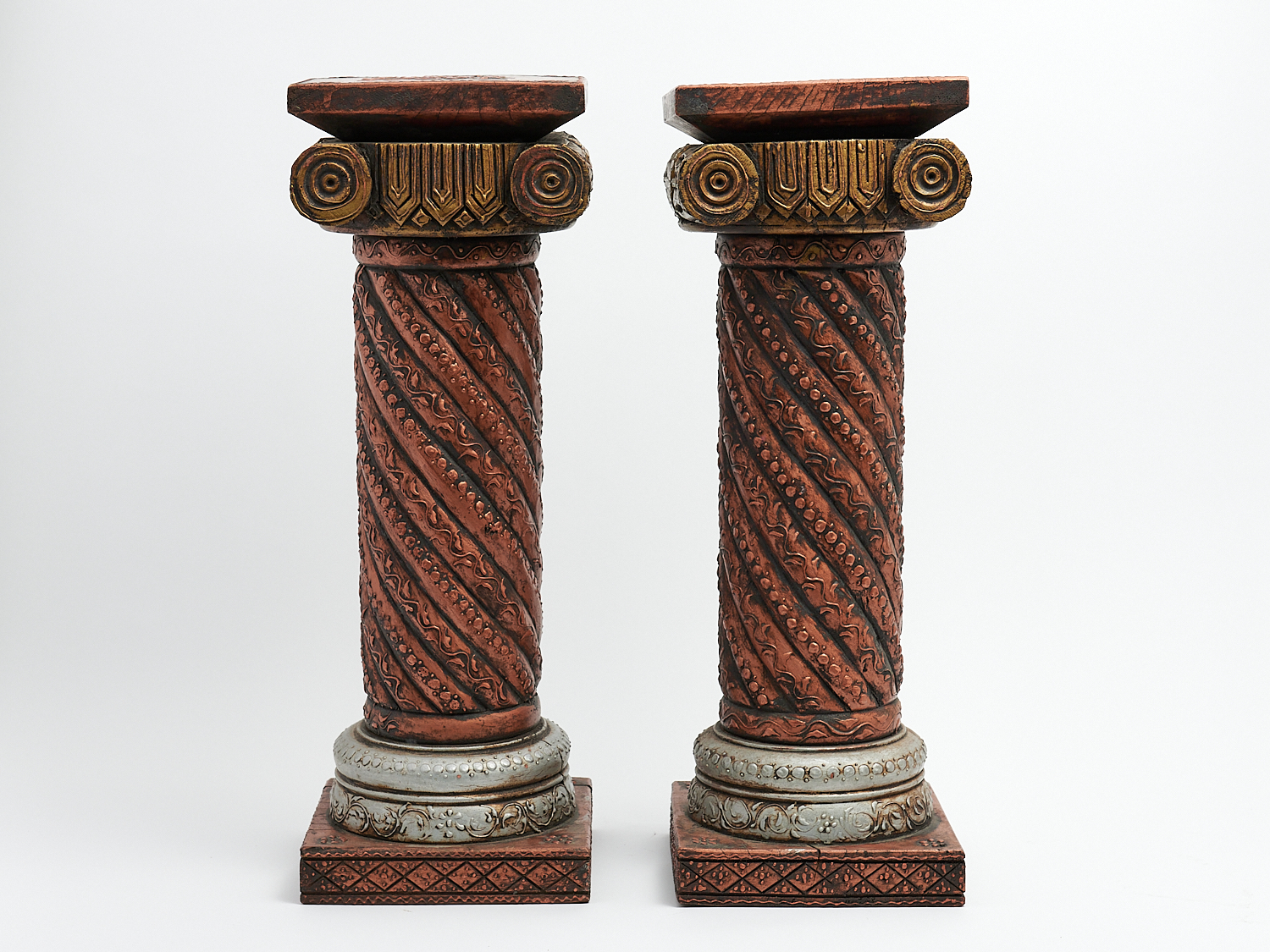 A PAIR OF DECORATED TIMBER PEDESTALS H.62CM (A/F), LEONARD JOEL LOCAL DELIVERY: MEDIUM