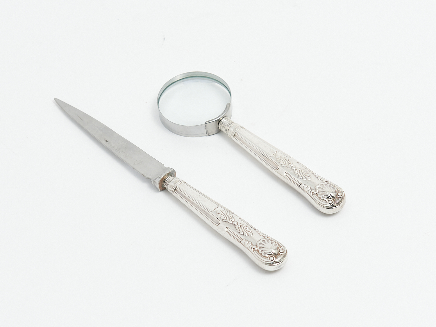 A STERLING SILVER COLLARED MAGNIFYING GLASS AND LETTER OPENER L.22CM (LARGEST), LEONARD JOEL LOCAL DELIVERY: SMALL