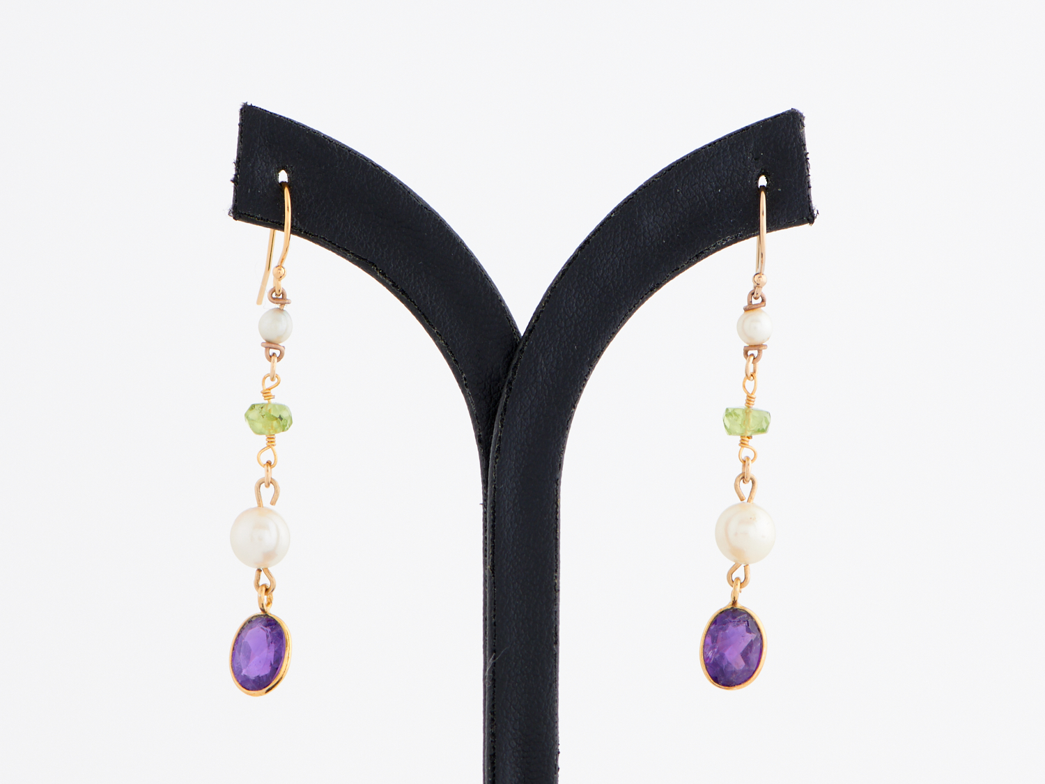 A PAIR OF AMETHYST, CULTURED PEARL AND PERIDOT DROP EARRINGS, TO SHEPHERDS HOOK FITTINGS IN 9CT GOLD