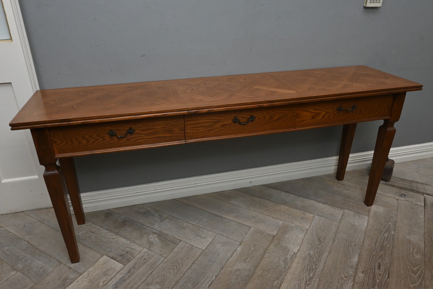 AN OAK HALL TABLE WITH A MARQUETRY TOP AND THREE FRIEZE DRAWERS (83H X 200W X 50D CM) (THIS HEAVY ITEM MUST BE REMOVED BY CLIENTS OR CARRIERS AT THE CUSTOMERS EXPENSE. LEONARD JOEL STAFF CANNOT ASSIST CARRYING THIS ITEM)