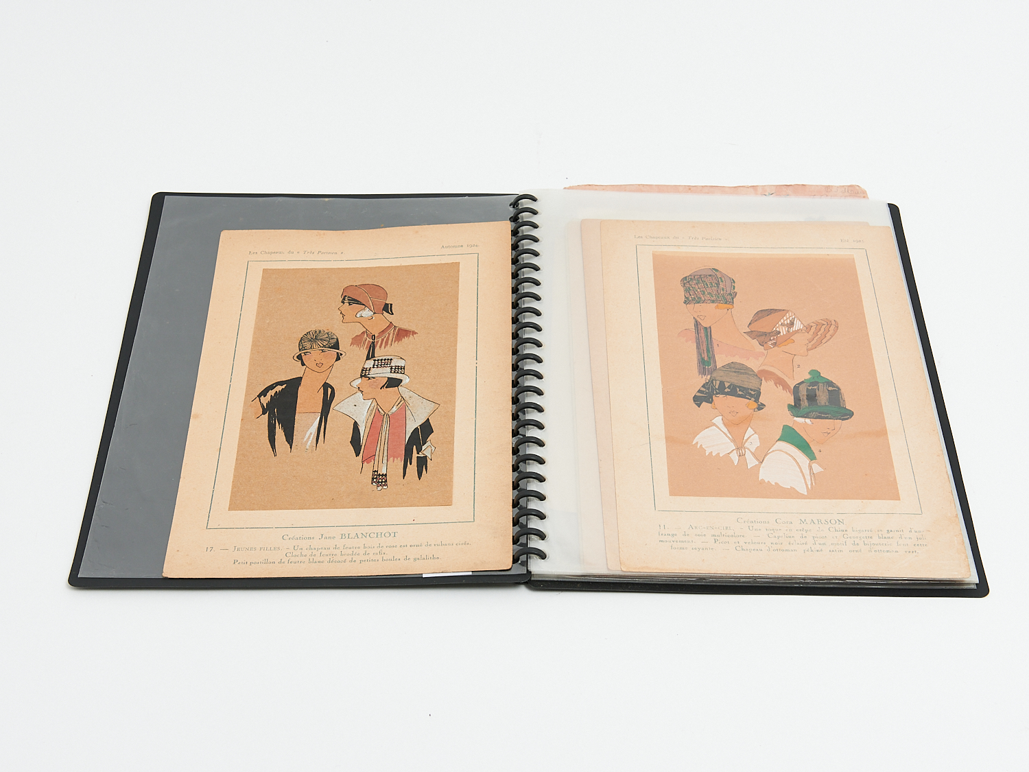 A COLLECTION OF 11 1920S FRENCH FASHION HAT DRAWINGS TOGETHER WITH 1925 "LES CHAPEAUX DU TRES PARISIEN.." AND SPRING 1926 INVITATION FOR THE SHOW DAY, MELBOURNE H.31CM (LARGEST), LEONARD JOEL LOCAL DELIVERY: SMALL