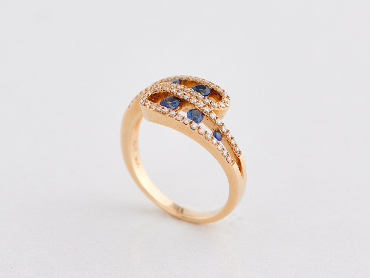 A DIAMOND AND SAPPHIRE SET RING IN 14CT GOLD, RING SIZE N, WEIGHT 4.6GMS.