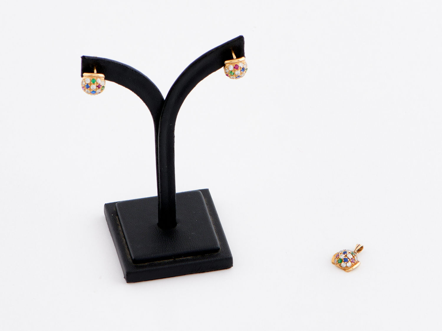 A MULTI GEM SET SUITE INCLUDING EARRINGS TO POST AND LEVERBACK FITTINGS AND A PENDANT IN 14CT GOLD, WEIGHT 6.2GMS