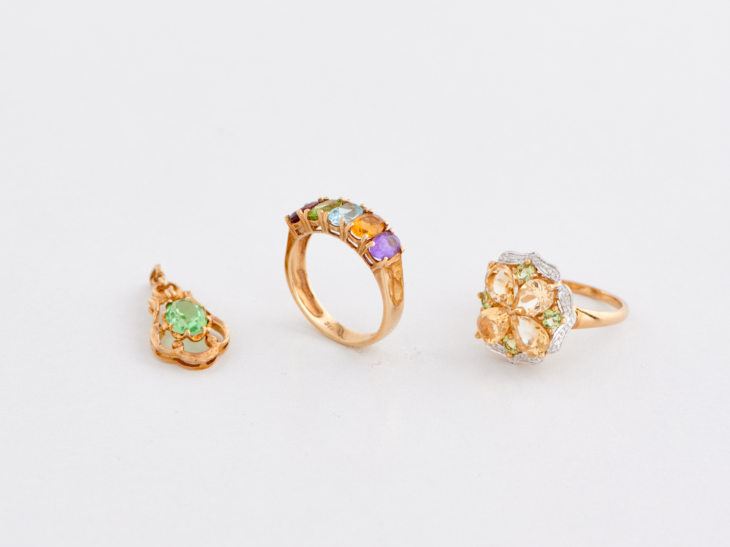 ONE GEM AND DIAMOND SET RING IN 9CT GOLD, RING SIZE Q, WITH ANOTHER GEM SET RING IN 9CT GOLD, RING SIZE O, COMBINED WEIGHT 6.5GMS, TOGETHER WITH A PENDANT IN GOLD PLATE, 1.5GMS.