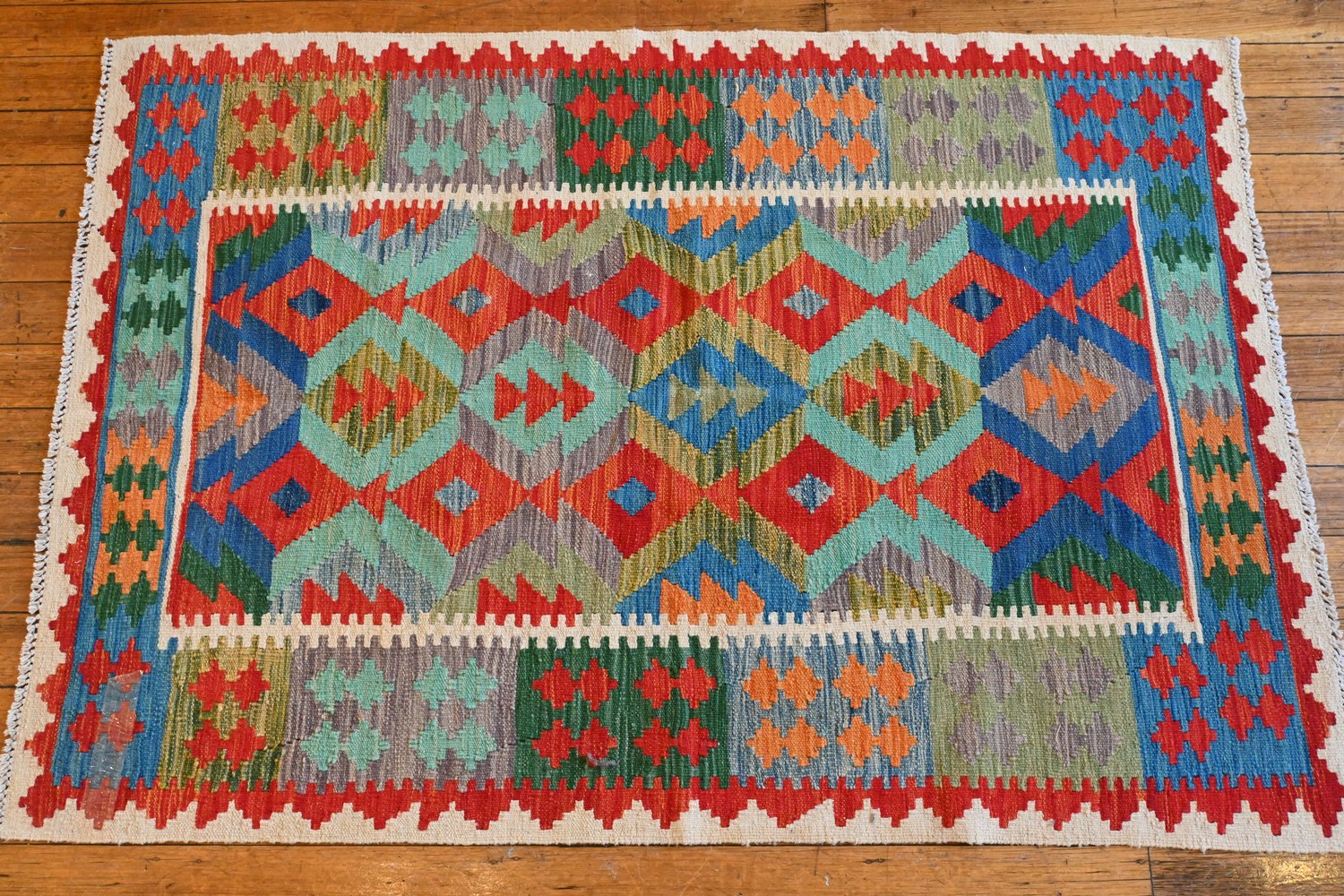 A HANDWOVEN CAUCASIAN DESIGN KILM WITH NATURAL VEGETABLE DYES, REVERSABLE (190 X 132 CM) (LEONARD JOEL DELIVERY SIZE: LARGE)