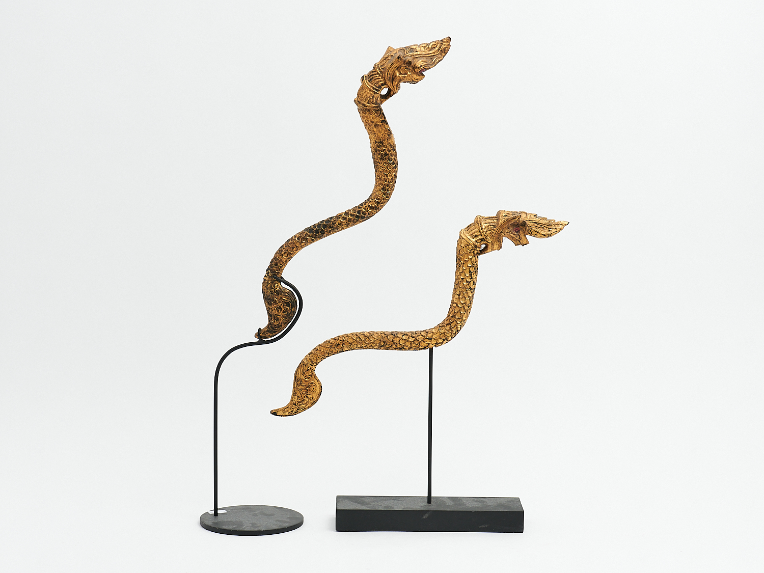 A PAIR OF THAI CEREMONIAL WOODEN SNAKES ON STANDS H.58CM (TALLEST), LEONARD JOEL HOME DELIVERY SIZE: MEDIUM