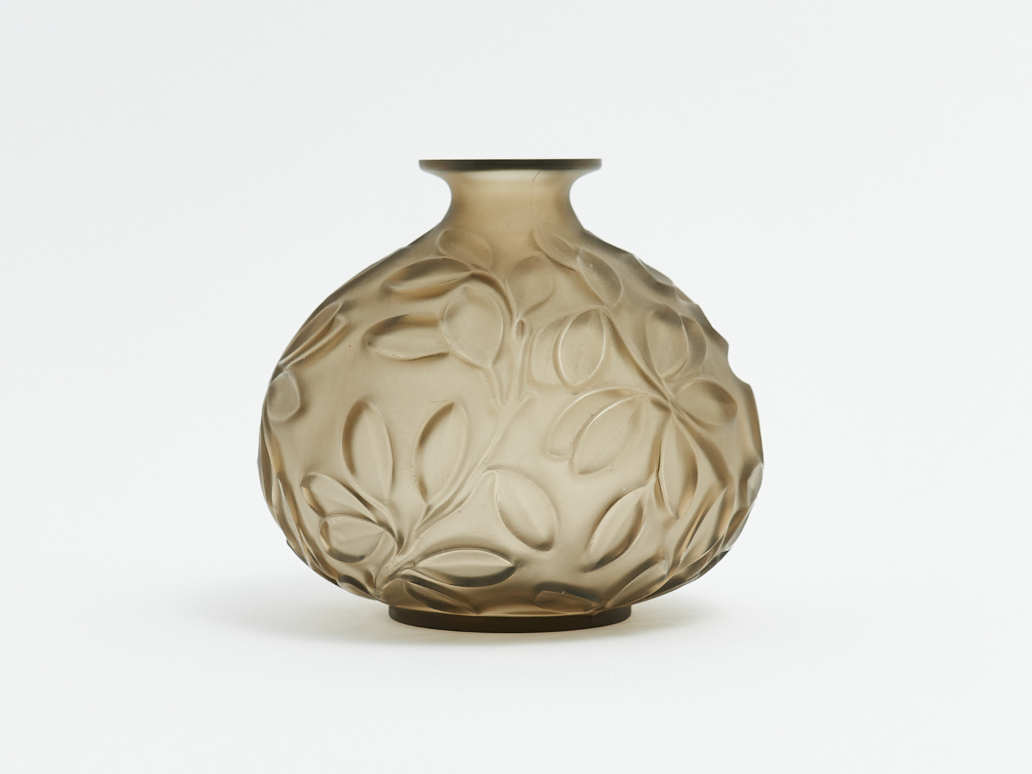 A LALIQUE FRANCE GREY GLASS VASE WITH LEAF PATTERN H.13.3CM, LEONARD JOEL LOCAL DELIVERY: SMALL