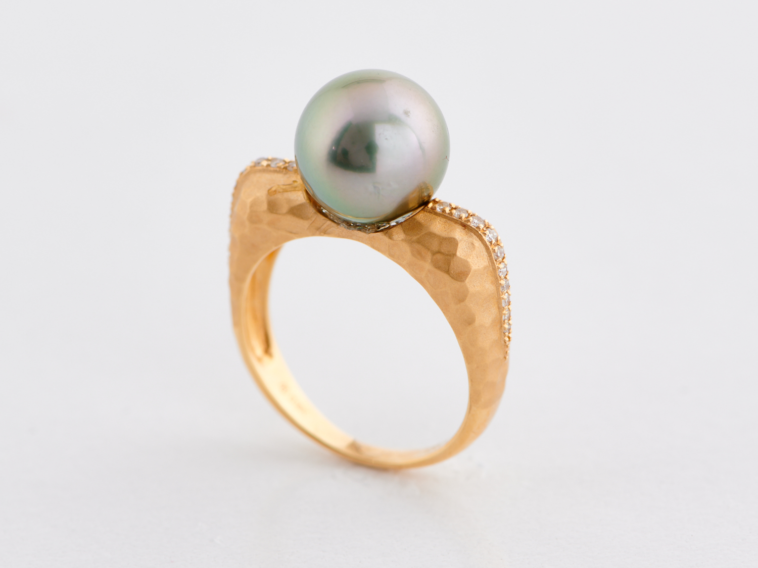 A TAHITIAN PEARL AND DIAMOND RING IN 18CT GOLD, THE PEARL MEASURING 10.9MM, RING SIZE P 1/2, WEIGHT 6.7GMS