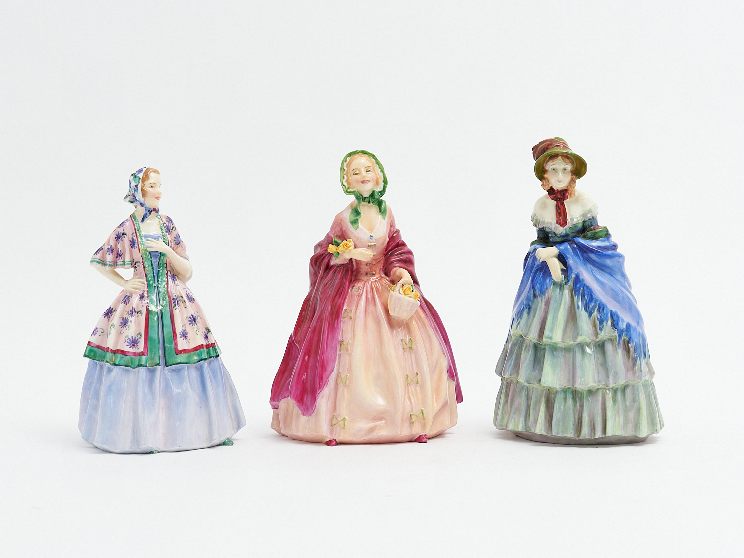 THREE ROYAL DOULTON FIGURINES MODELLED BY LESLIE HARRADINE INCLUDING "JASMINE" HN1862 1938-49 H.19CM, "ROSEBUD" HN1983 1945-52 H.20CM AND "A VICTORIAN LADY" HN1345 1929 H.20CM, LEONARD JOEL LOCAL DELIVERY: SMALL