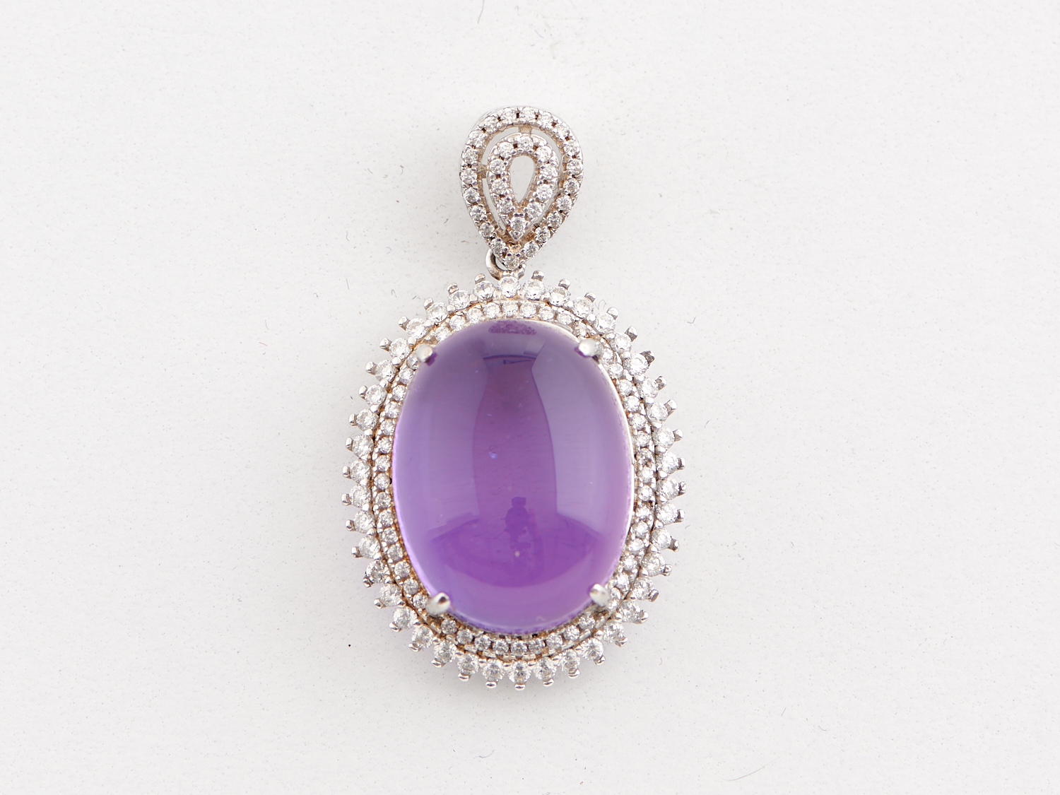 A CABOCHON CUT AMETHYST PENDANT NECKLACE IN STERLING SILVER, SIZE 35 X 21MM, CHAIN LENGTH 440MM, WEIGHT 9.2GMS