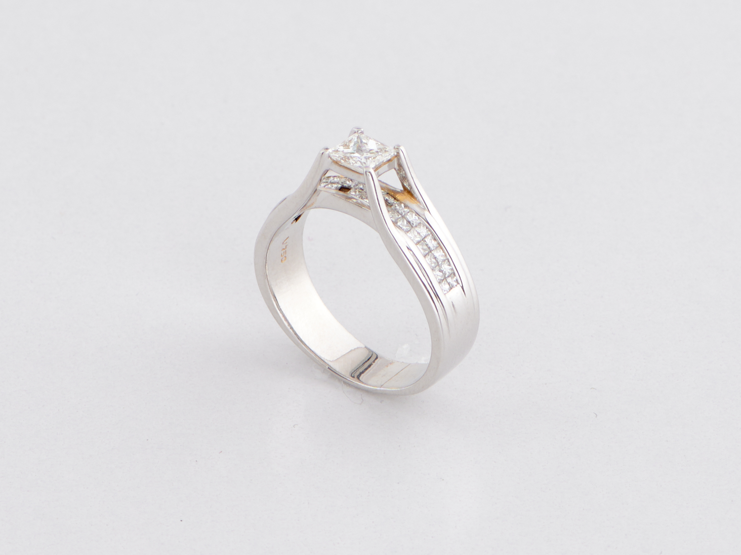A DIAMOND SET RING IN 18CT WHITE GOLD, THE CENTRING DIAMOND WEIGHING APPROXIMATETLY 0.7CTS, THE SHOULDERING DIAMONDS TOTALLING APPROXIMATLEY 0.5CTS, RING SIZE R-S, WEIGHT 8.7GMS