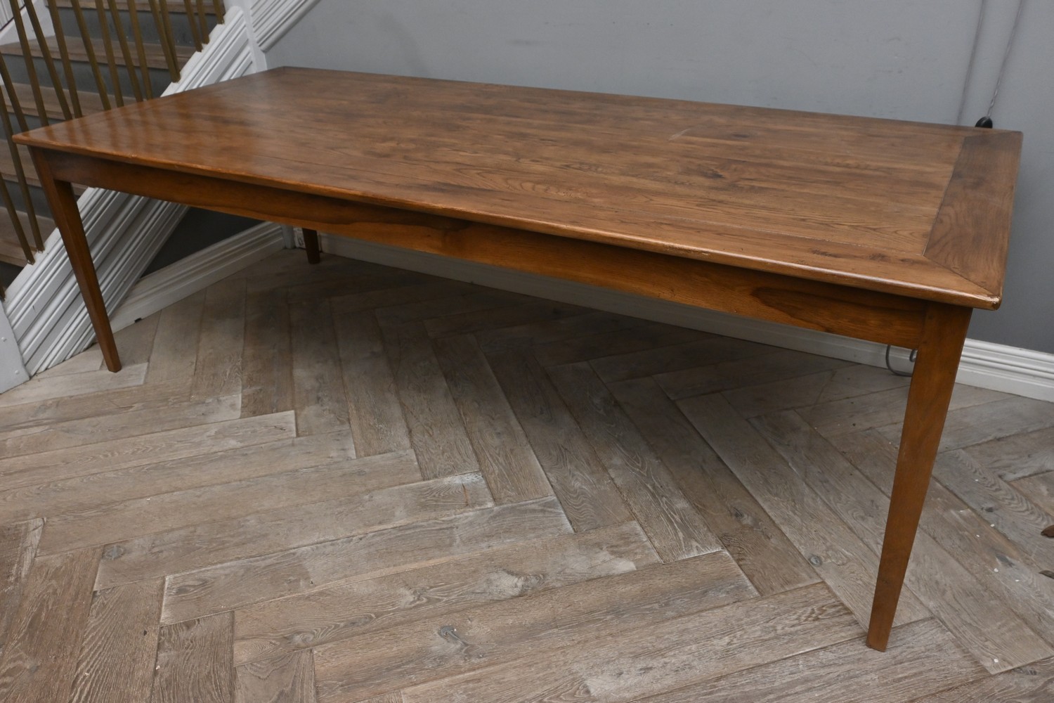 AN OAK FARMHOUSE-STYLE DINING TABLE (77H X 240W X 106D CM) (THIS HEAVY ITEM MUST BE REMOVED BY CLIENTS OR CARRIERS AT THE CUSTOMERS EXPENSE. LEONARD JOEL STAFF CANNOT ASSIST CARRYING THIS ITEM)