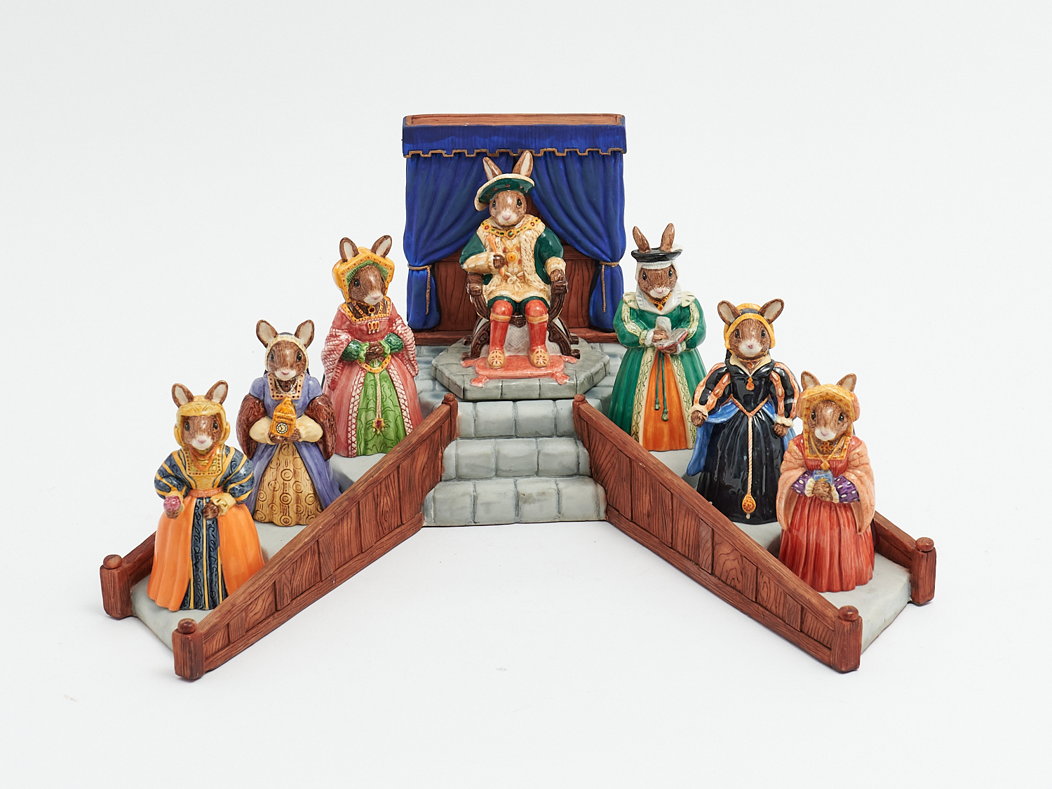 ROYAL DOULTON BUNNYKINS "ARTHURIAN LEGEND" COLLECTION COMPRISING SIX FIGURES AND DISPLAY BASE (A/F) L.33CM, LEONARD JOEL LOCAL DELIVERY: SMALL