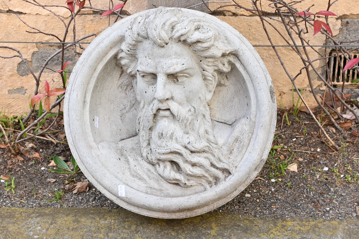 A VINTAGE CONCRETE CIRCULAR WALL PLACK OF ZEUS (A/F) (40 DIAMETER X 20D CM) (THIS HEAVY ITEM MUST BE REMOVED BY CLIENTS OR CARRIERS AT THE CUSTOMERS EXPENSE. LEONARD JOEL STAFF CANNOT ASSIST CARRYING THIS ITEM)