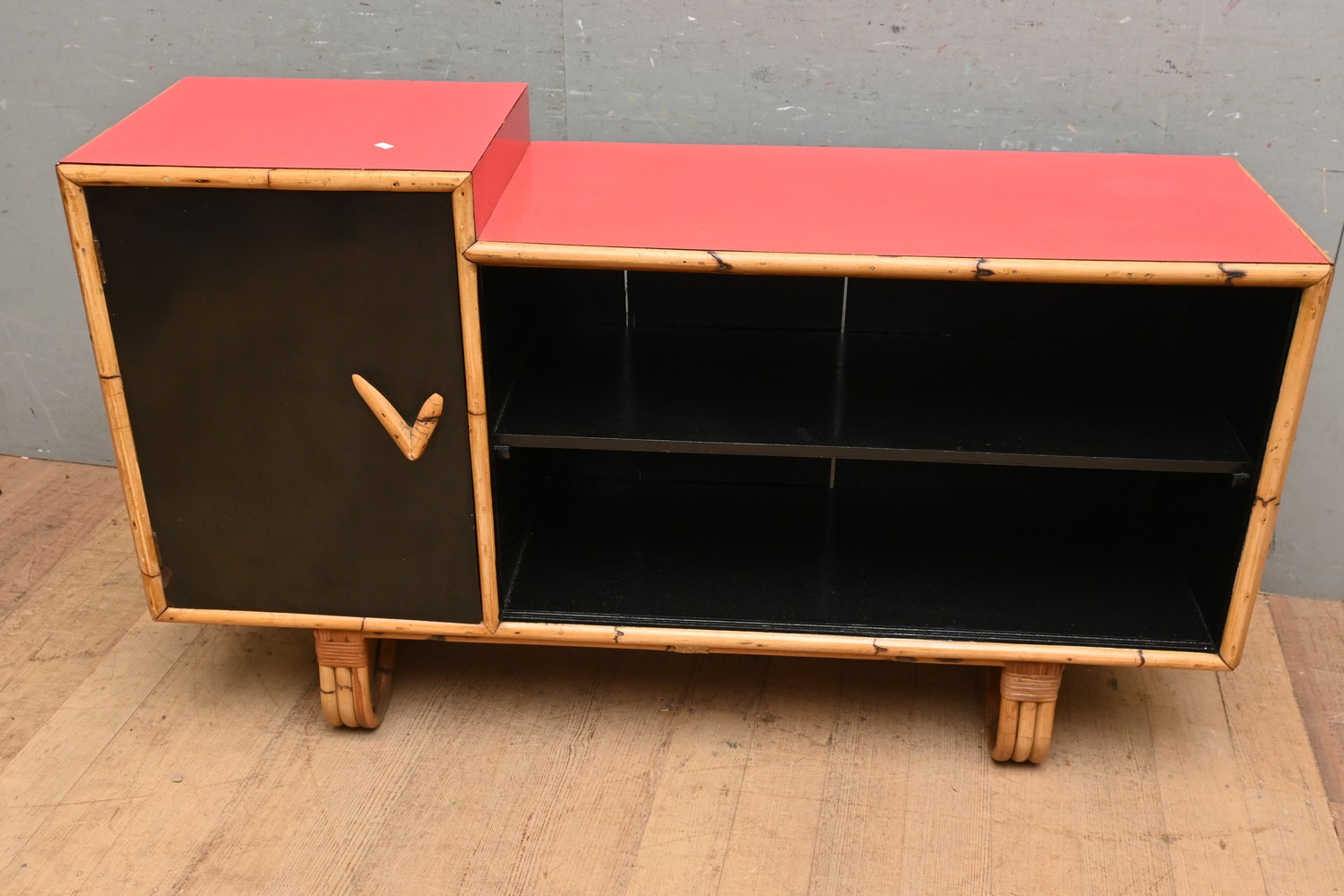 A RETRO BAMBOO AND MELAMINE SIDEBOARD BY MING AND CO - MALAYU (ORIGINAL LABLE TO FRONT BASE) (81H X 138W X 39D CM) (LEONARD JOEL DELIVERY SIZE: X-LARGE)