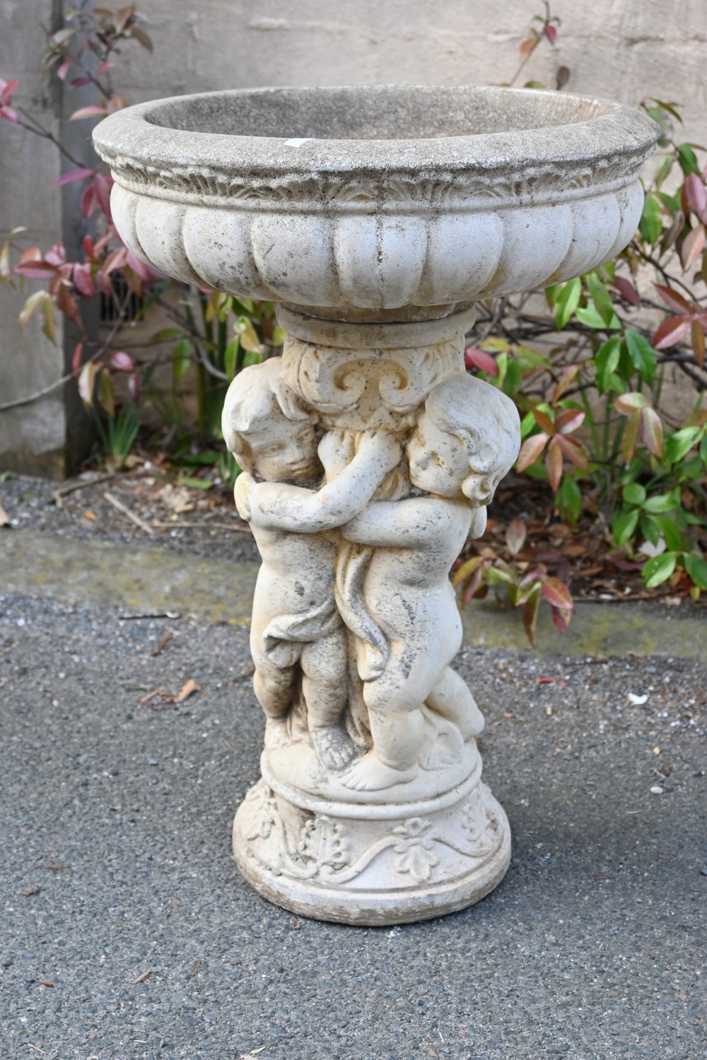 A RECONSTITUTED STONE FIGURAL BASED BIRD BATH (A/F) (66H X 43D CM) (THIS HEAVY ITEM MUST BE REMOVED BY CLIENTS OR CARRIERS AT THE CUSTOMERS EXPENSE. LEONARD JOEL STAFF CANNOT ASSIST CARRYING THIS ITEM)