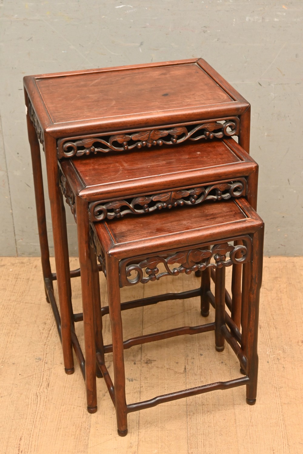 NEST OF THREE CARVED CHINESE ROSEWOOD TABLES (A/F) (64H X 44W X 32D CM) (LEONARD JOEL DELIVERY SIZE: LARGE)
