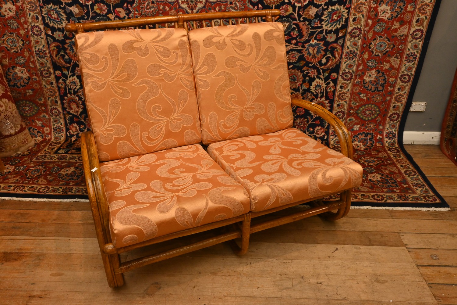 A 1950S BAMBOO TWO SEATER LOUNGE WITH GOLD FABRIC CUSHIONS ( A/F) ( 97H X 120W X 95D CM) (LEONARD JOEL DELIVERY SIZE: X-LARGE)