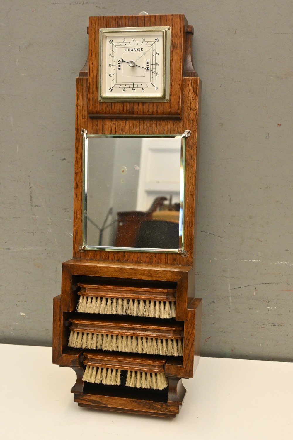 AN ENGLISH OAK BAROMETER AND MIRRORED HANGING BRUSH SET (62H X CM) (LEONARD JOEL DELIVERY SIZE: MEDIUM)