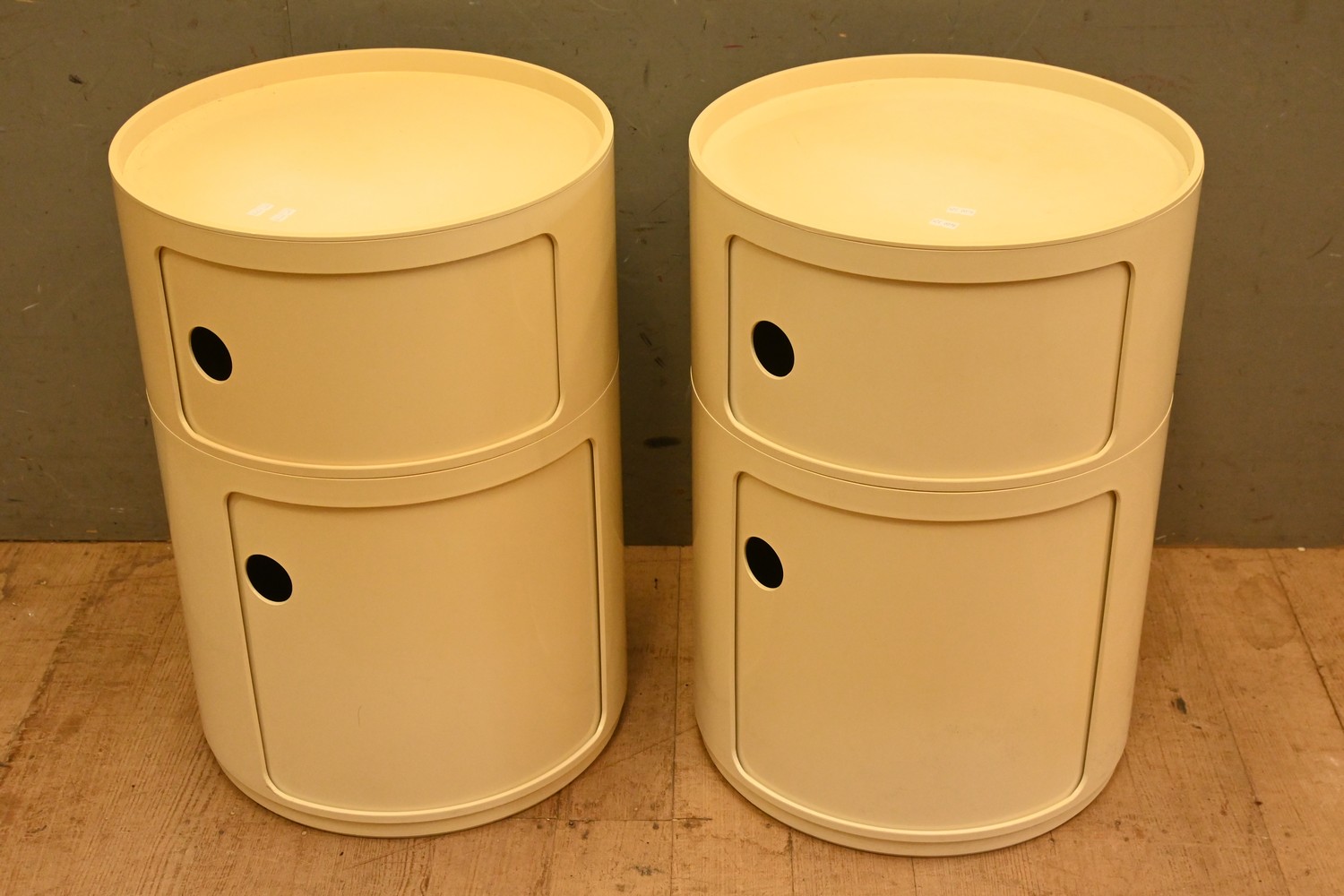 A PAIR OF SIGNED ITALIAN KARTELL CREAM STACKING CIRCULAR CABINETS (A/F) (61H X 42D CM) (LEONARD JOEL DELIVERY SIZE: LARGE)