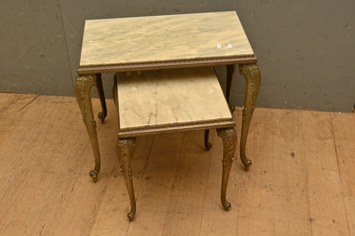 A PAIR OF ITALIAN BRASS AND MARBLE TOPPED NESTING SIDE TABLES (44H X 55W X 35D CM) (LEONARD JOEL DELIVERY SIZE: LARGE)