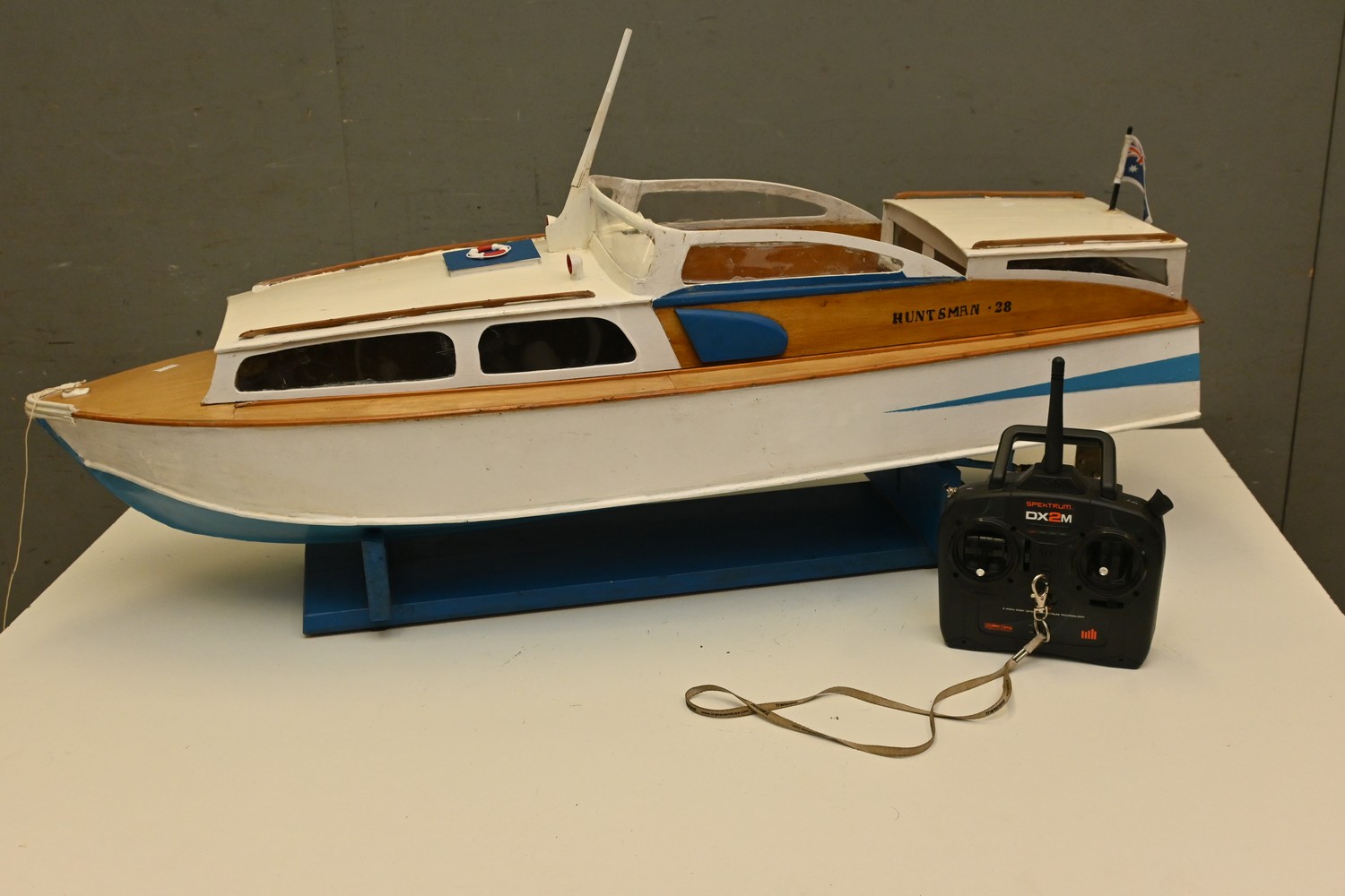 A 1950S SCRATCH BUILT WOODEN REMOTE CONTROL CRUISER BOAT -UNTESTED (A/F) (50H X 108W X 34D CM) (LEONARD JOEL DELIVERY SIZE: LARGE)