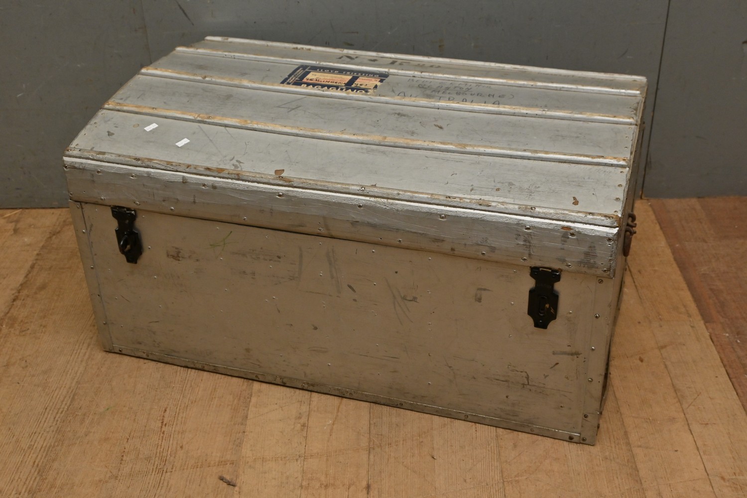 A WOODEN DOME TOP WOODEN TRUNK (A/F) (46H X 92W X 58D CM) (LEONARD JOEL DELIVERY SIZE: X-LARGE)